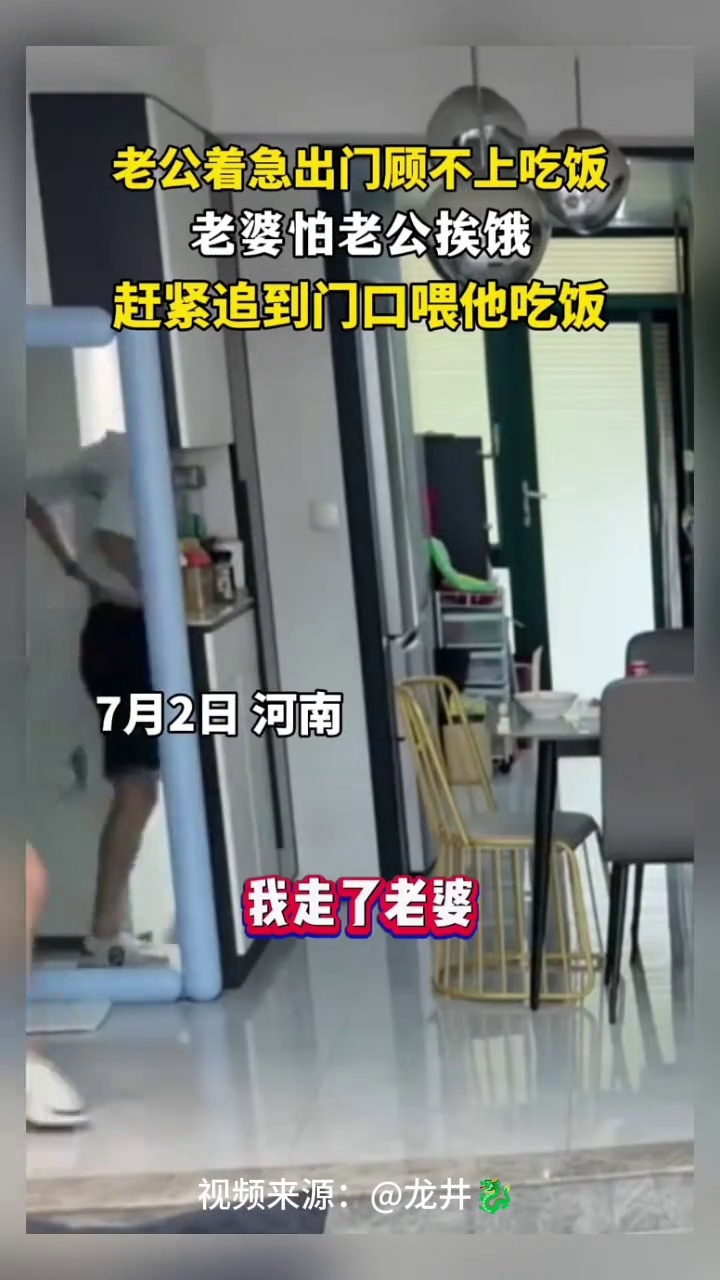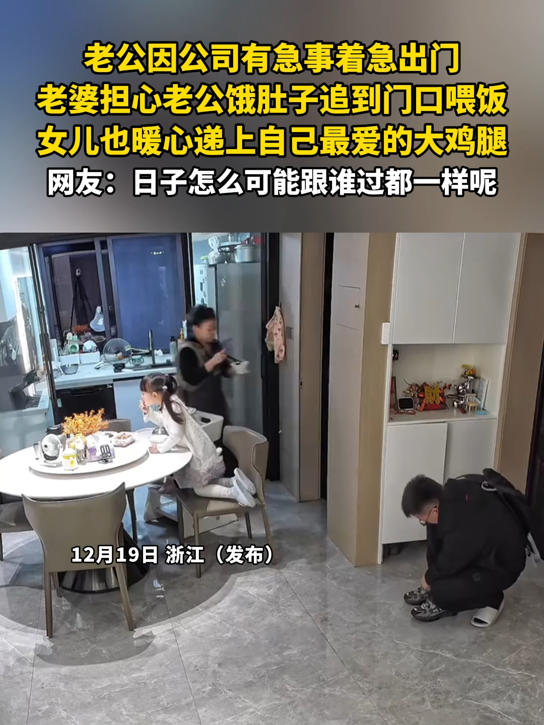 老公因公司有急事着急出门,老婆担心老公饿肚子追到门口喂饭,女儿也暖心递上自己最爱的大鸡腿_腾讯新闻