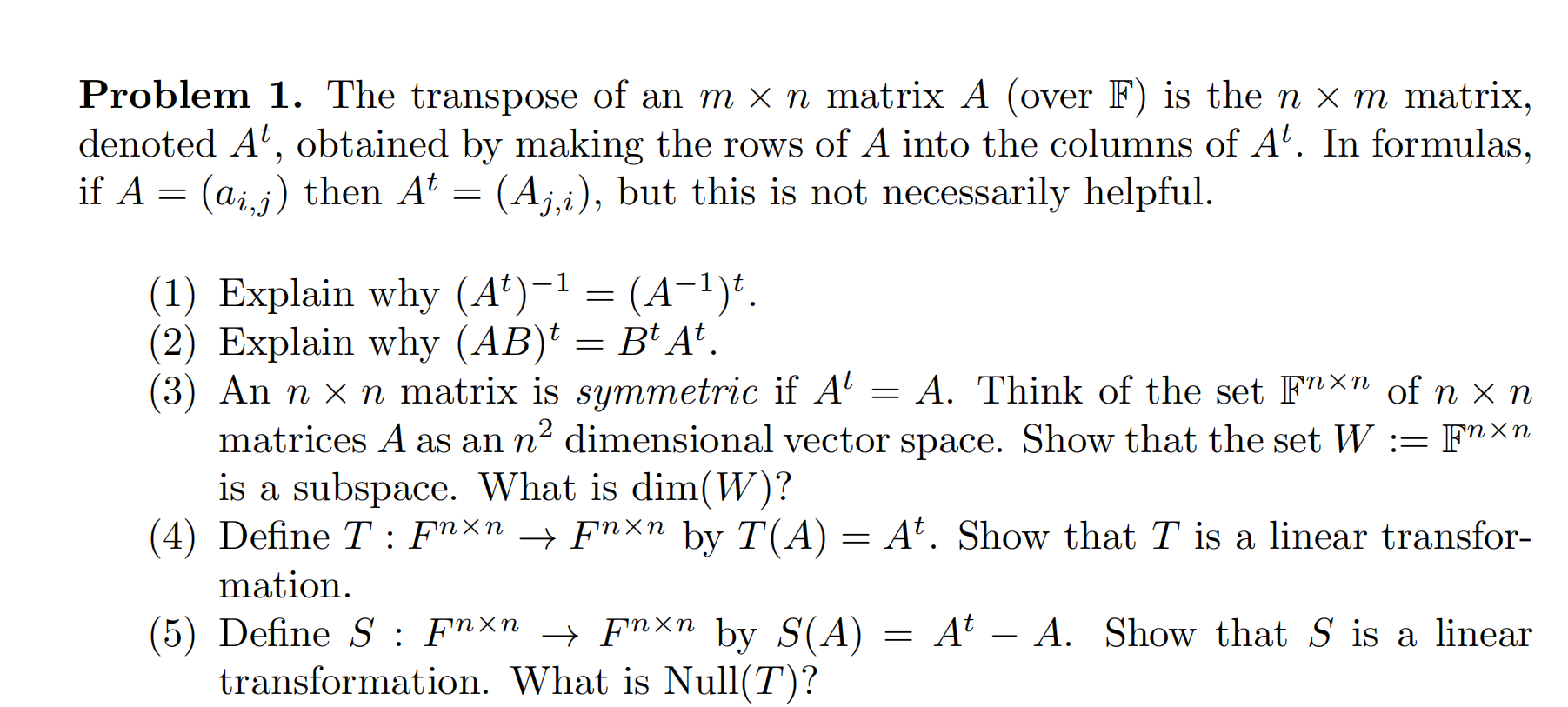 Solved Problem 1. The transpose of an m x n matrix A (over | Chegg.com