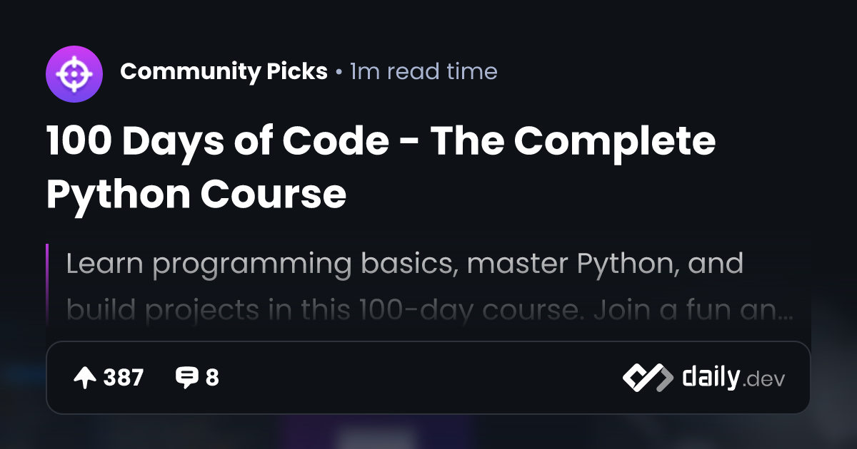 Based on this image's title: “100 Days of Code - The Complete Python Course | daily.dev”