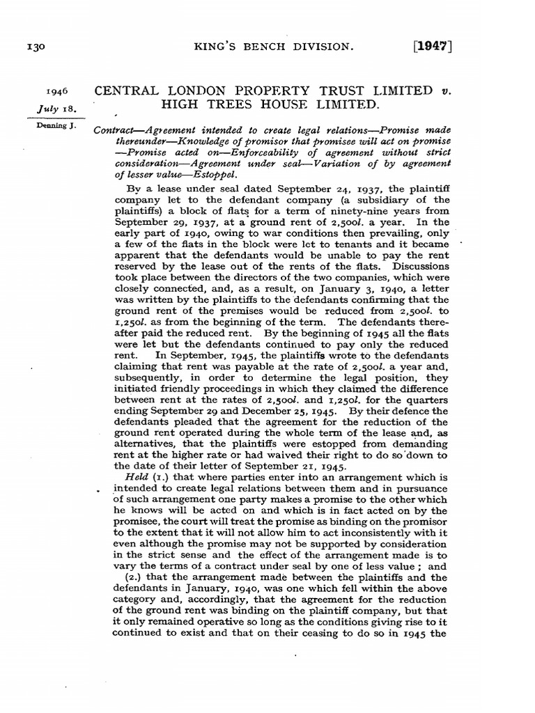 Central London Property Trust Ltd v High Trees House Ltd (1947): Case ...