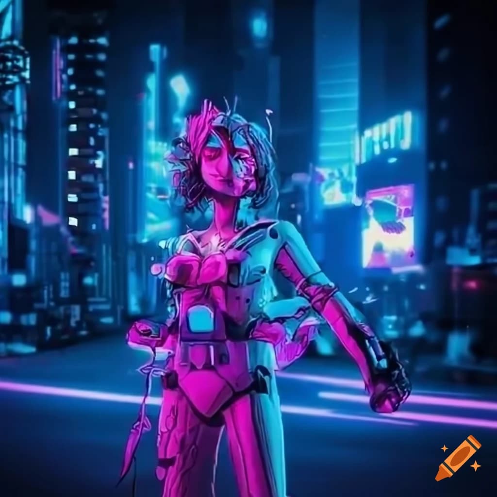 Neon cyberpunk Valkyrie android in a futuristic city on Craiyon