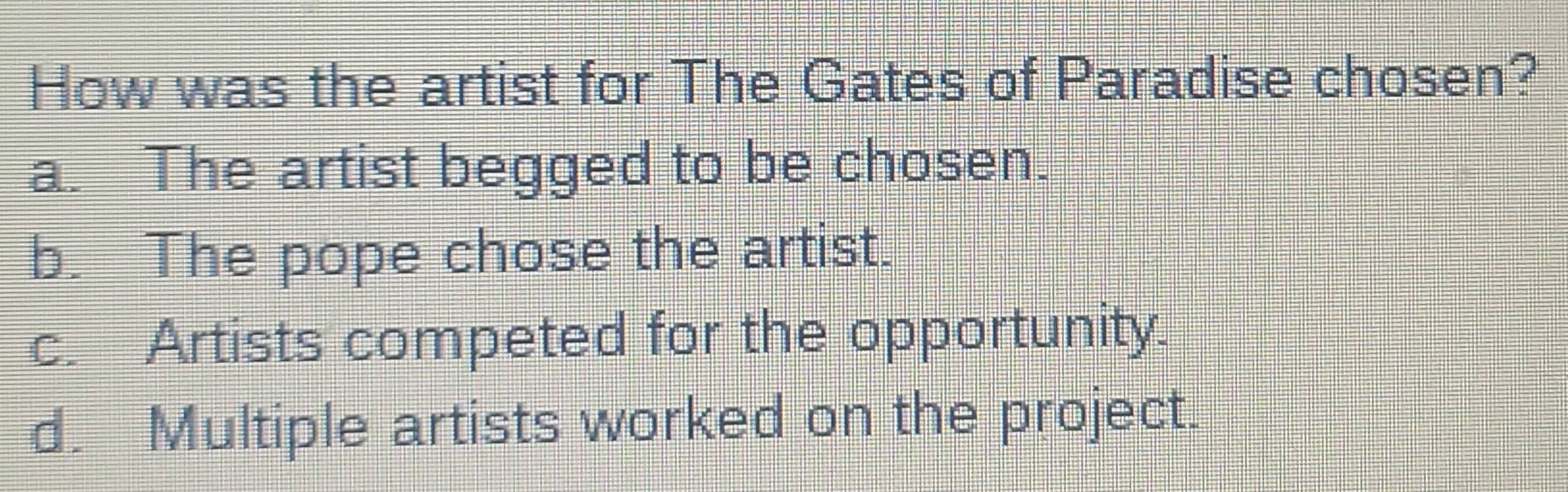 Solved: How was the artist for The Gates of Paradise chosen? a. The ...