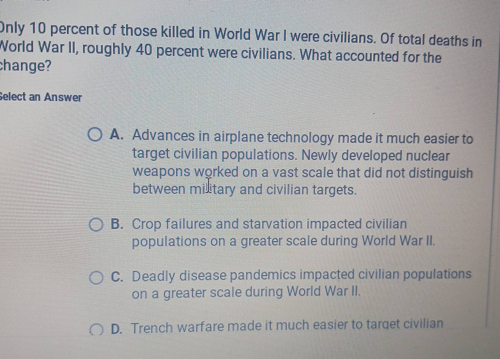 Solved: Only 10 percent of those killed in World War I were civilians ...