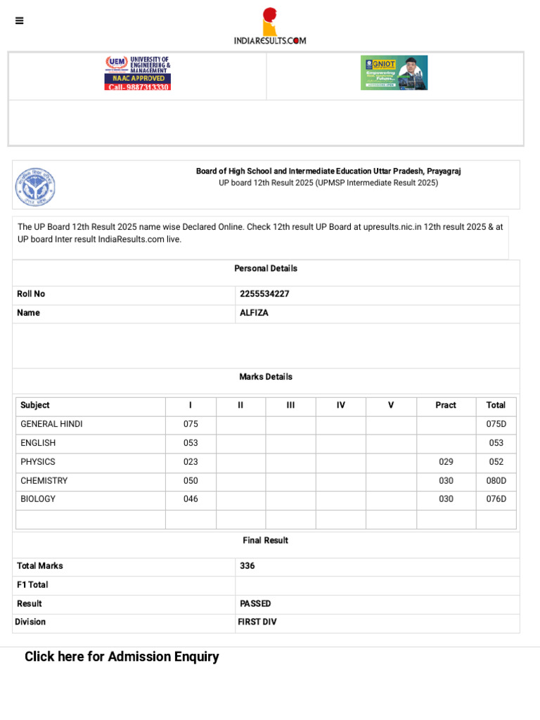 UP Board 12th Result 2025 (UPMSP Intermediate Result 2025) - UP Board | PDF