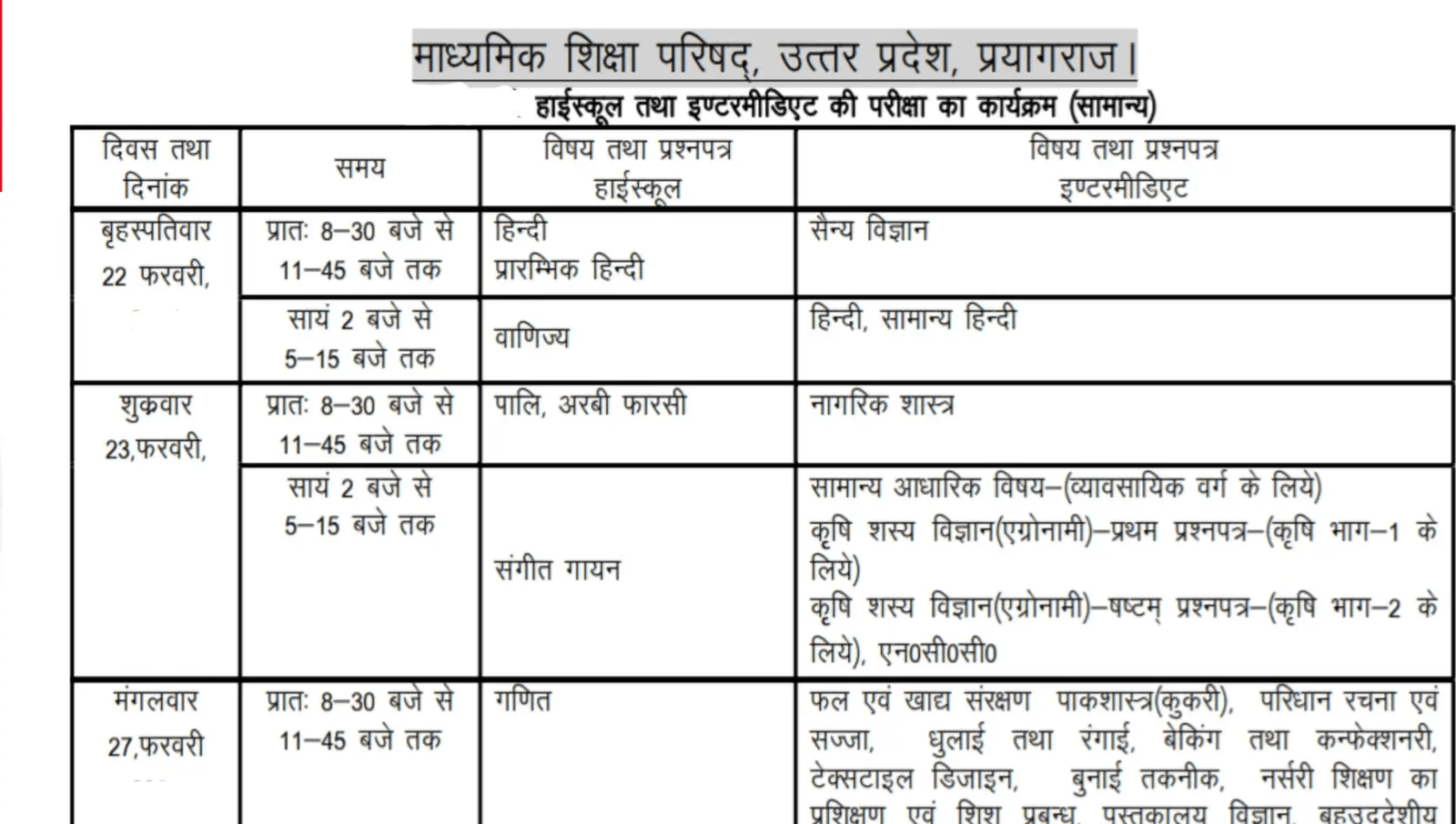 UP Board Time Table 2026, UPMSP Class 10th and 12th Date Sheet on upmsp ...