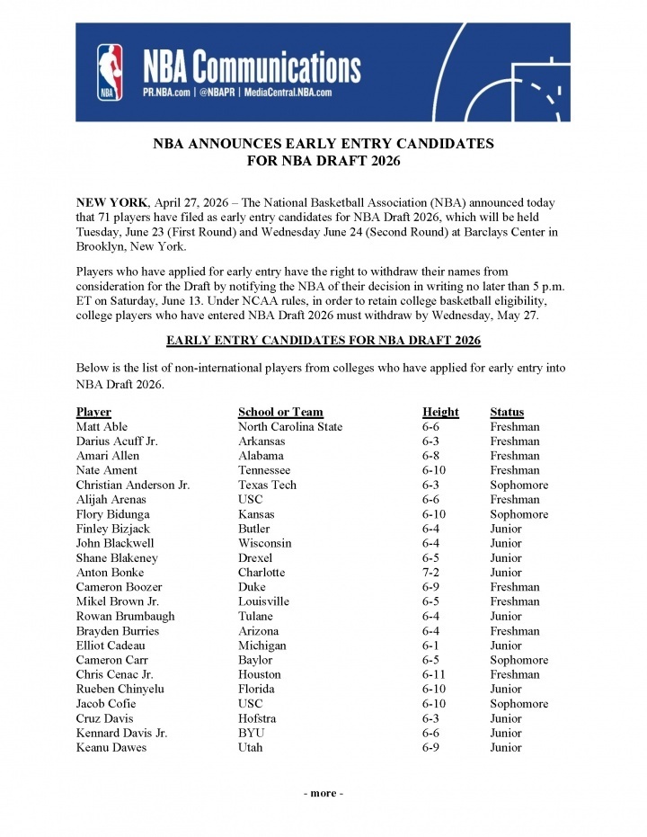 NBA选秀早申名单:迪班萨、皮特森、布泽尔、威尔逊均在列_腾讯新闻