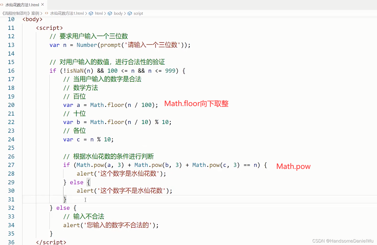 JS if 水仙花数 游乐园门票计算 闰年 三元运算符 for循环 算法 穷举法 While 拔萝卜 等差数 随机数函数random 区间数 ...