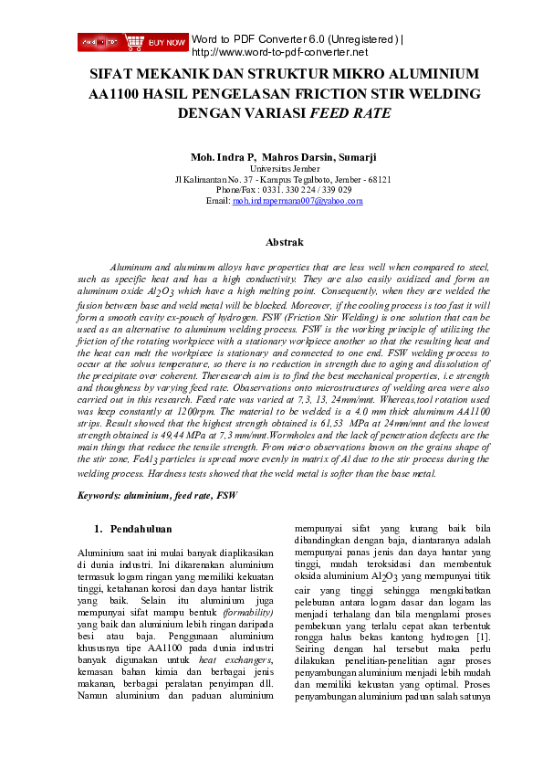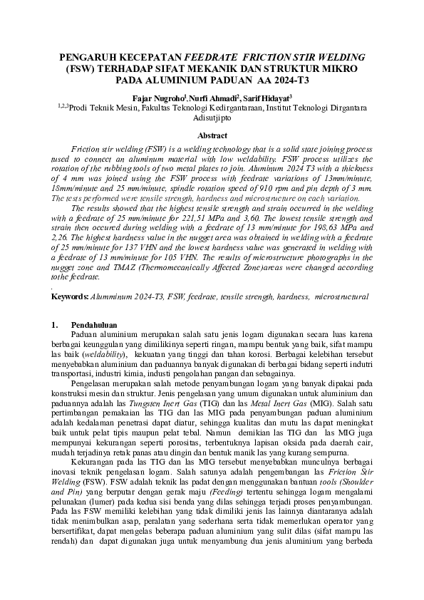 (PDF) Pengaruh Kecepatan Feedrate Friction Stir Welding (FSW) Terhadap ...
