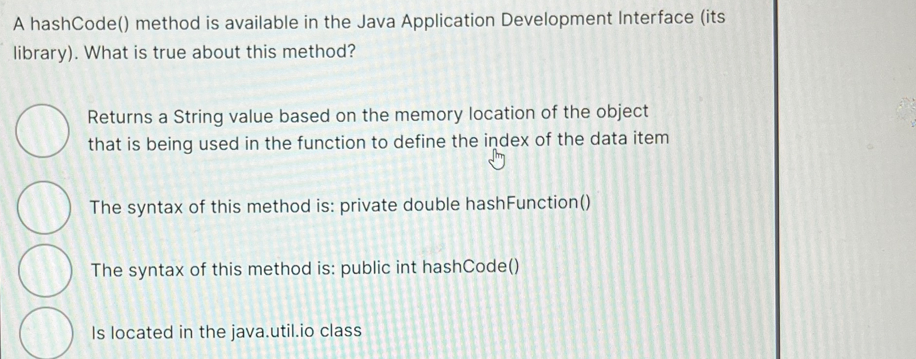 Based on this image's title: “Solved [10 marks] Java's hashCode method returns an integer | Chegg.com”
