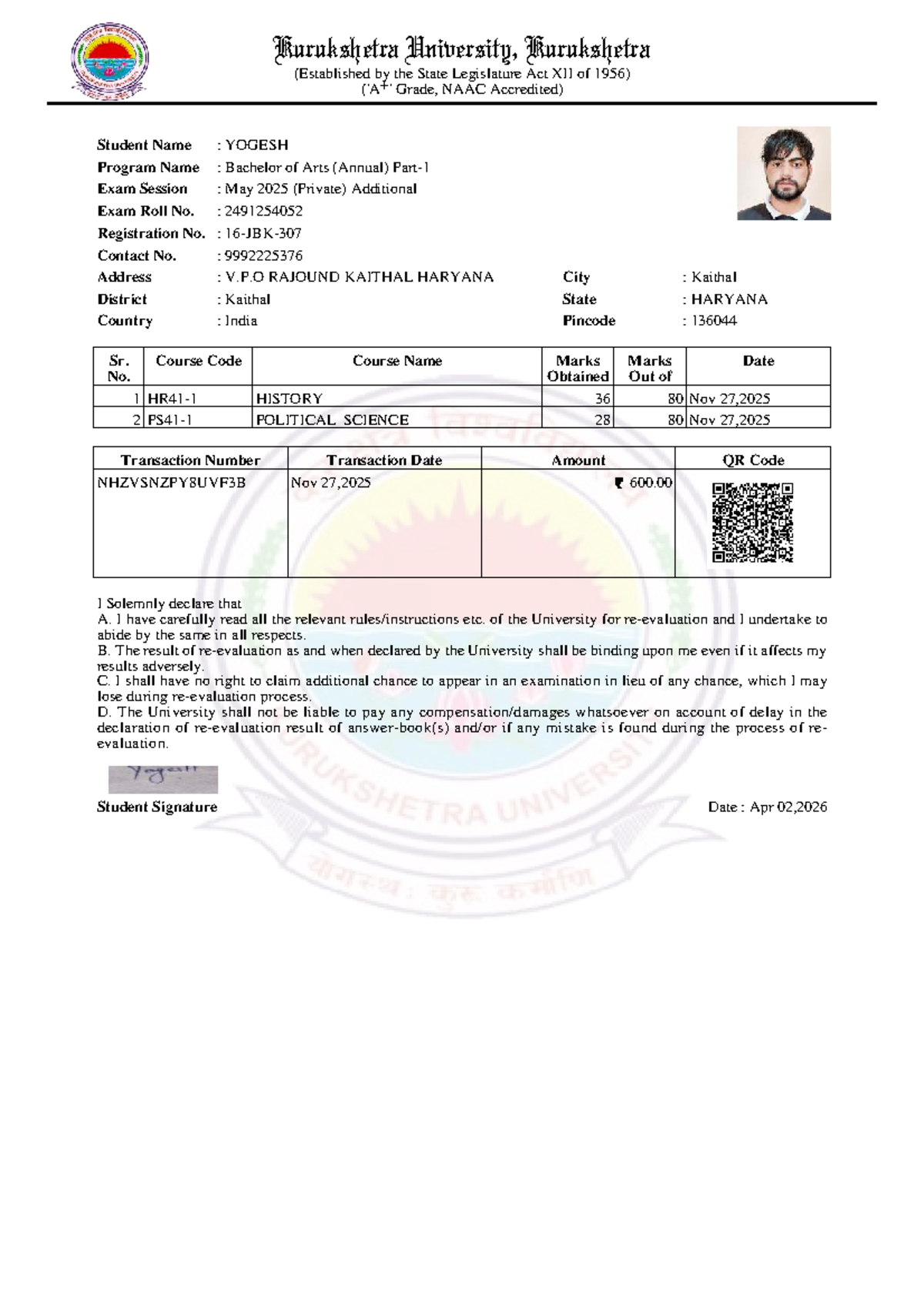 Re-Evaluation Application for BA History & Political Science (May 2025 ...