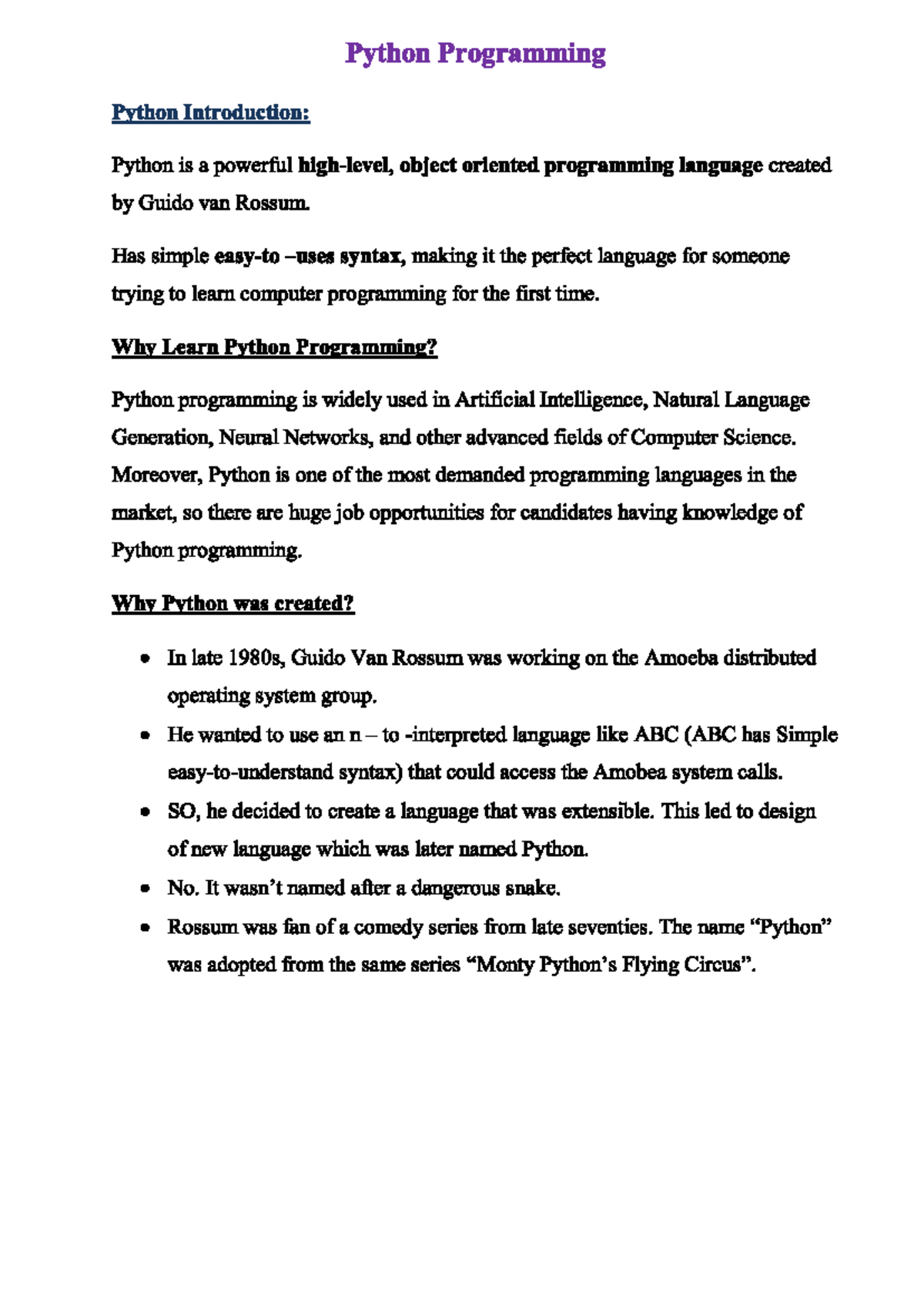 Notes Introduction to Python - Introduction to Python Python is an easy ...