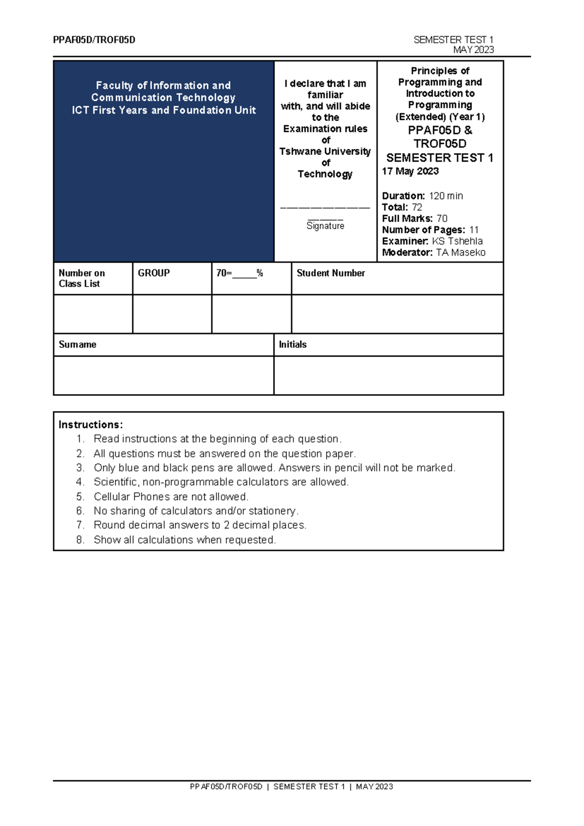 Semester Test 1 2023 - Principles of Programming (PPAF05D, TROF05D ...