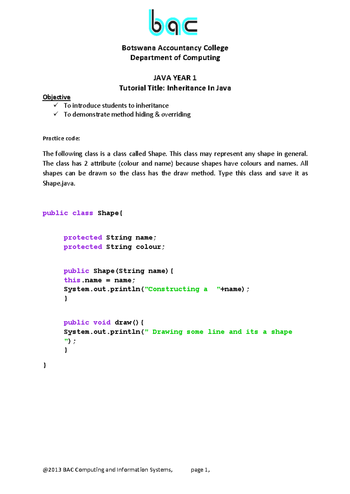 BAC Computing and Information Systems: JAVA Year 1 Inheritance Tutorial ...