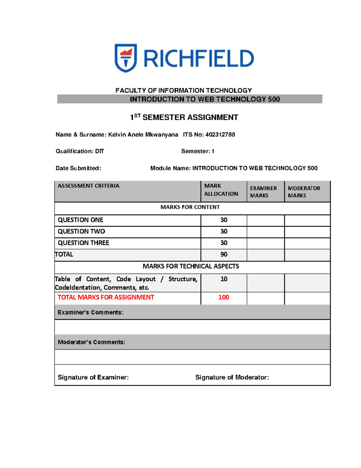 402312788 Introduction to Web Technology 500 Semester 1 Assignment ...