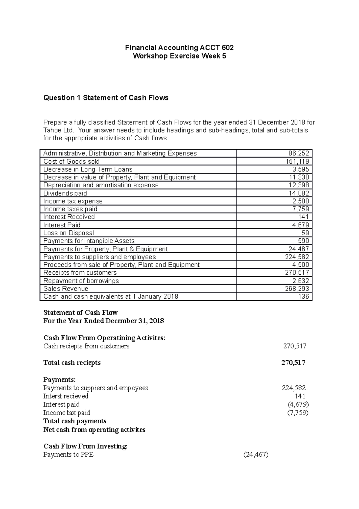 Workshop Exercise Cash Flow - Week 5 - Financial Accounting ACCT 602 ...