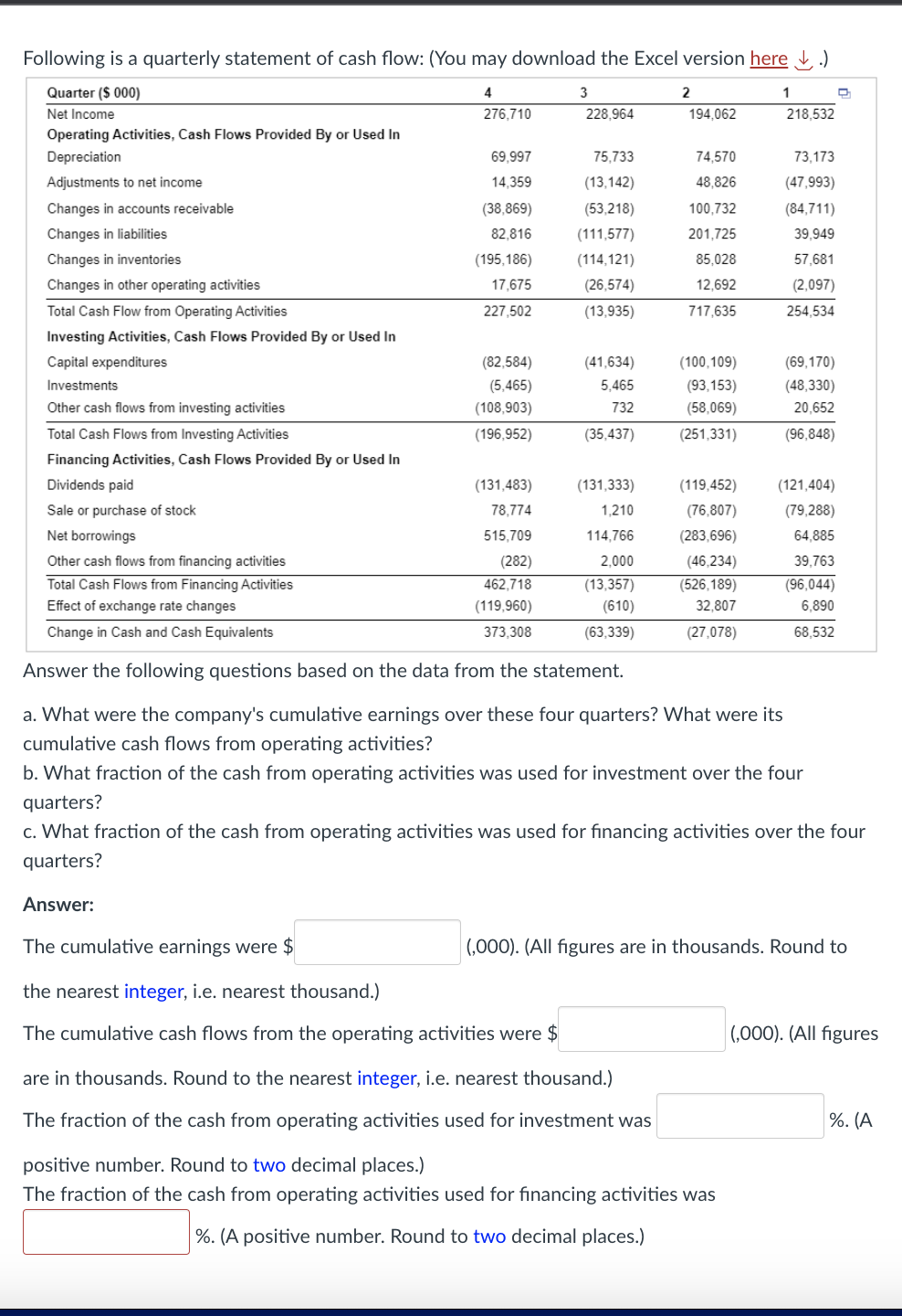 Solved Following is a quarterly statement of cash flow: (You | Chegg.com