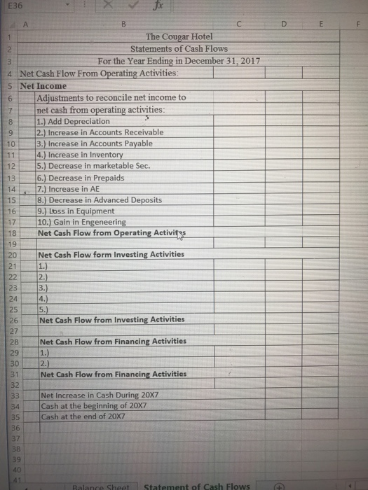 E36 The Cougar Hotel Statements of Cash Flows For the | Chegg.com