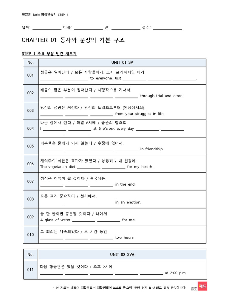천일문 기본 Basic Ch01 영작연습지 Step 1 | PDF
