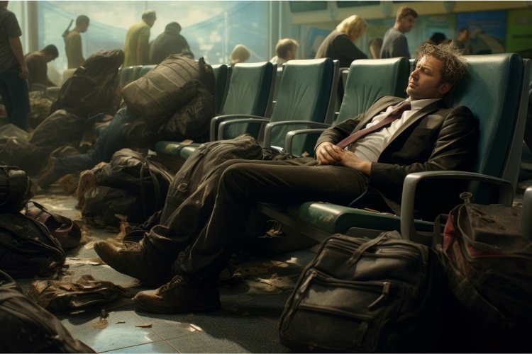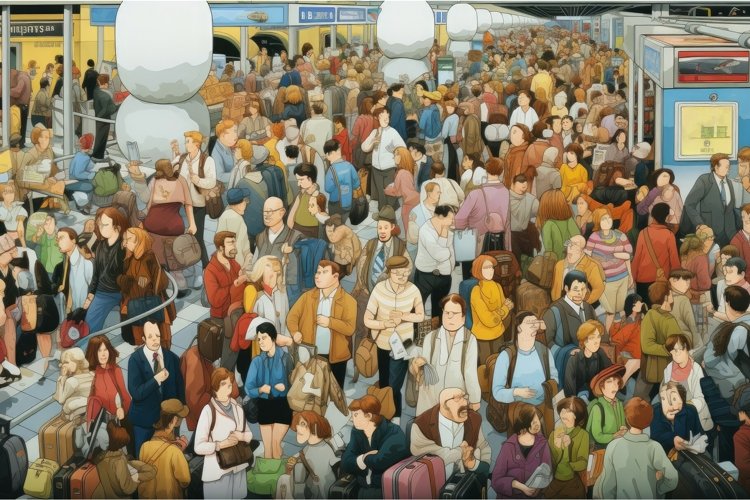 Chaotic Crowded airport tourist portrait. Generate Ai