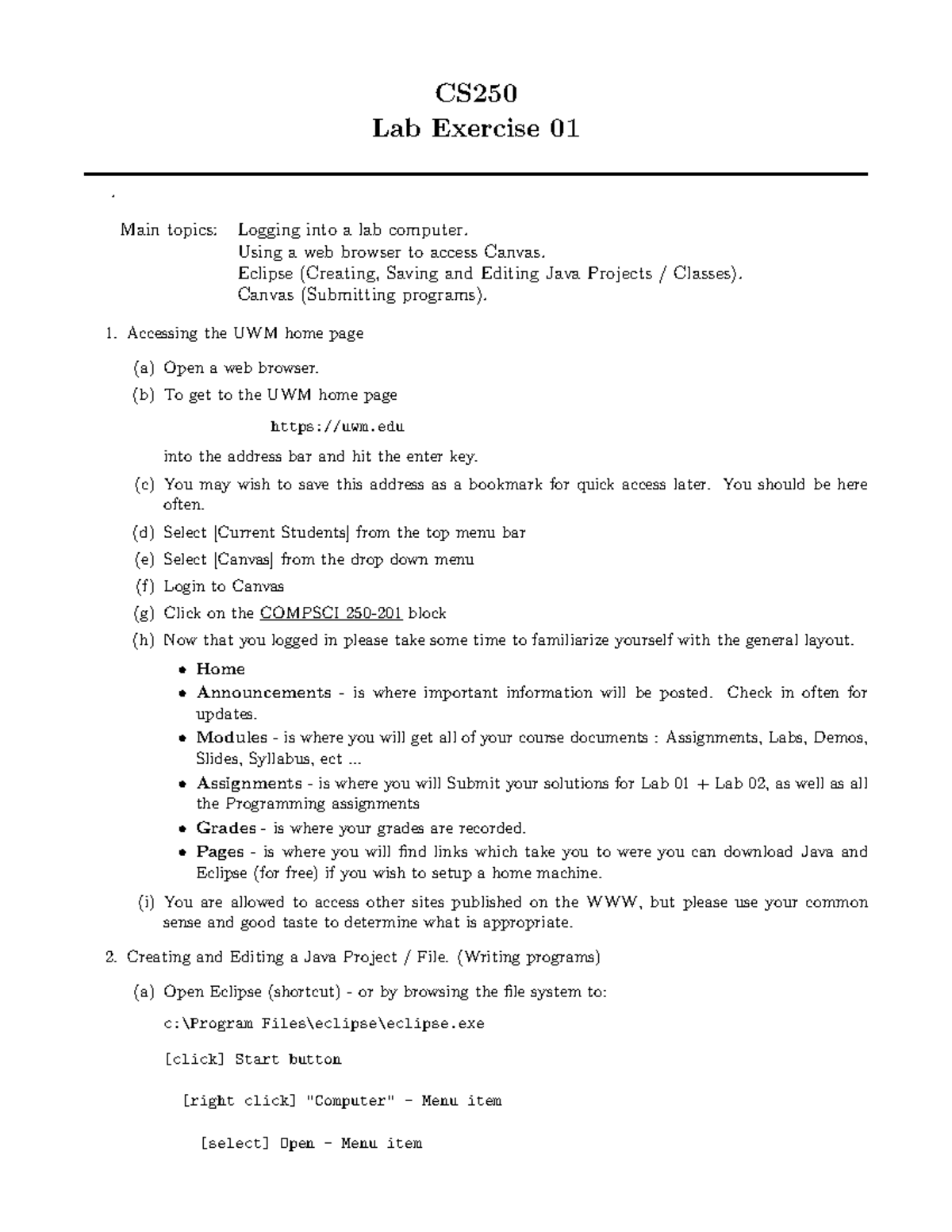 CS250 Lab Exercise 01: Java Project Creation & Canvas Submission Guide ...