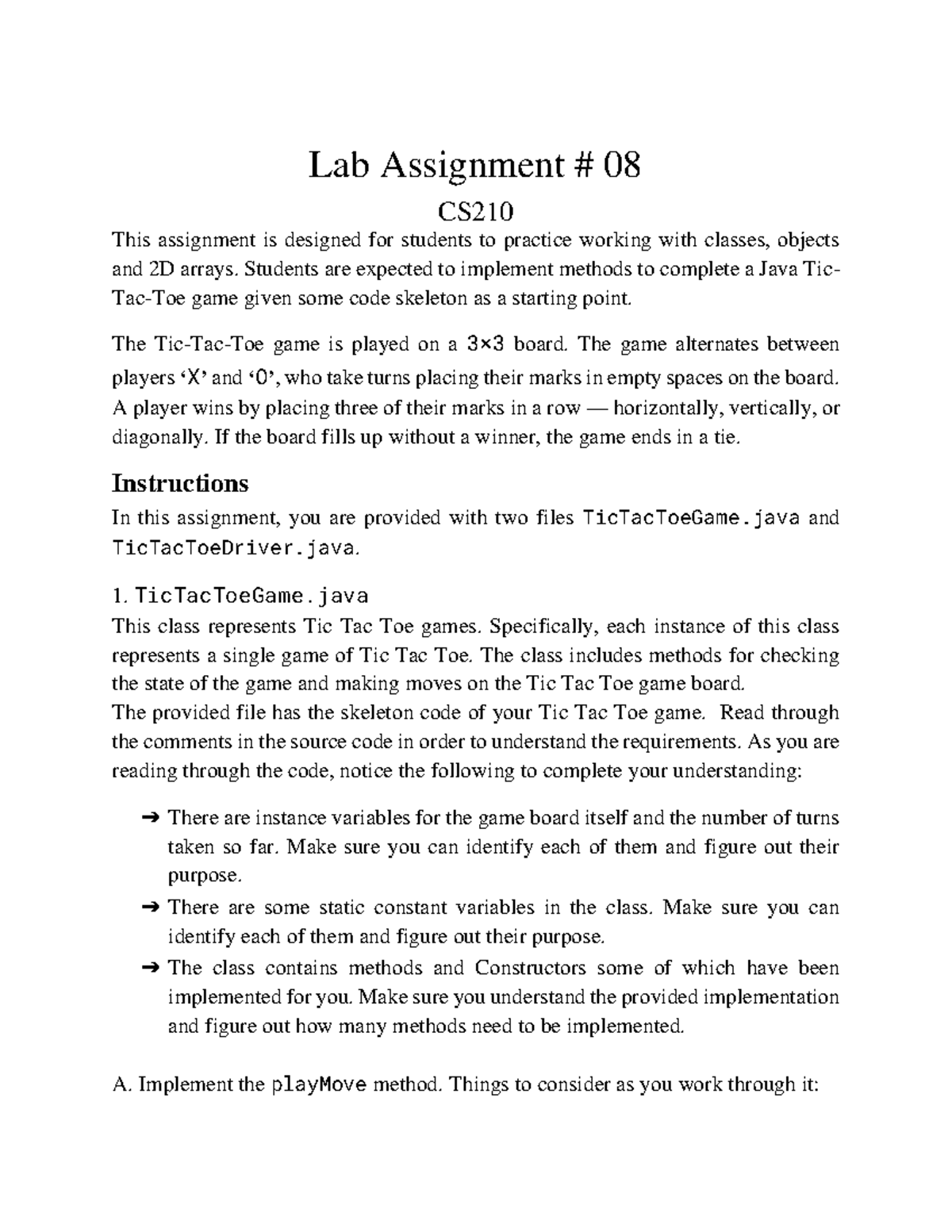 Lab Assignment 08: Java Tic Tac Toe Game for CS210 - Studocu