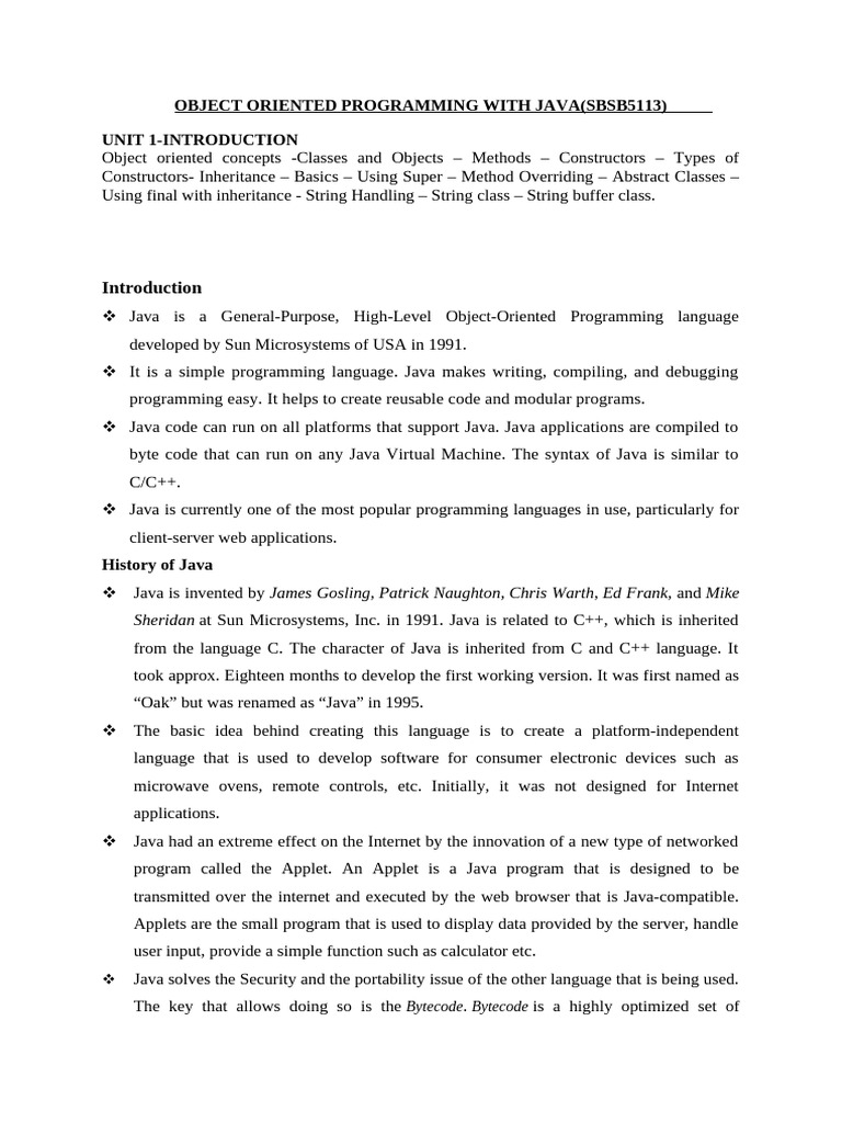 Java Unit 1 - notes for the subject java Unit1 - UNIT- Introduction ...