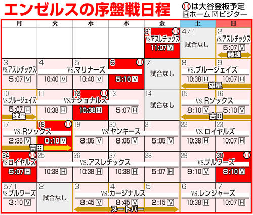大谷翔平エンゼルスの序盤戦日程 4月に吉田正尚、5月にヌートバーと侍対決/一覧 - MLB : 日刊スポーツ