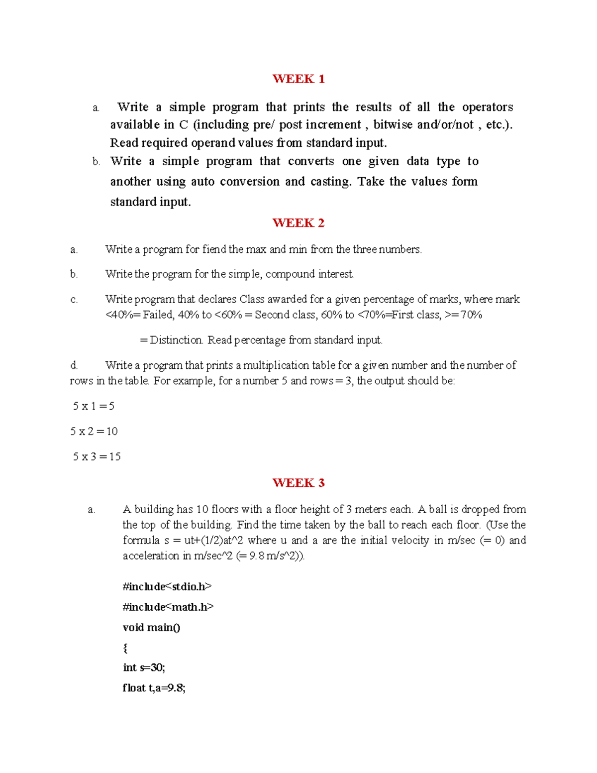 WEEK 1 - programs - WEEK 1 a. Write a simple program that prints the ...