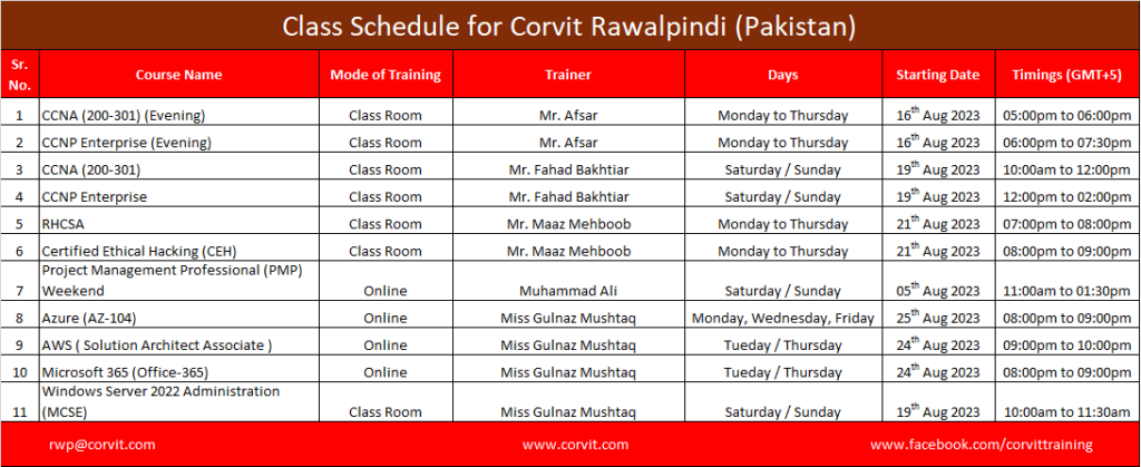 Rawalpindi Schedule | Corvit Systems
