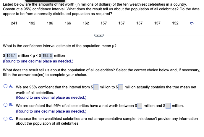 Solved Listed below are the amounts of net worth (in | Chegg.com