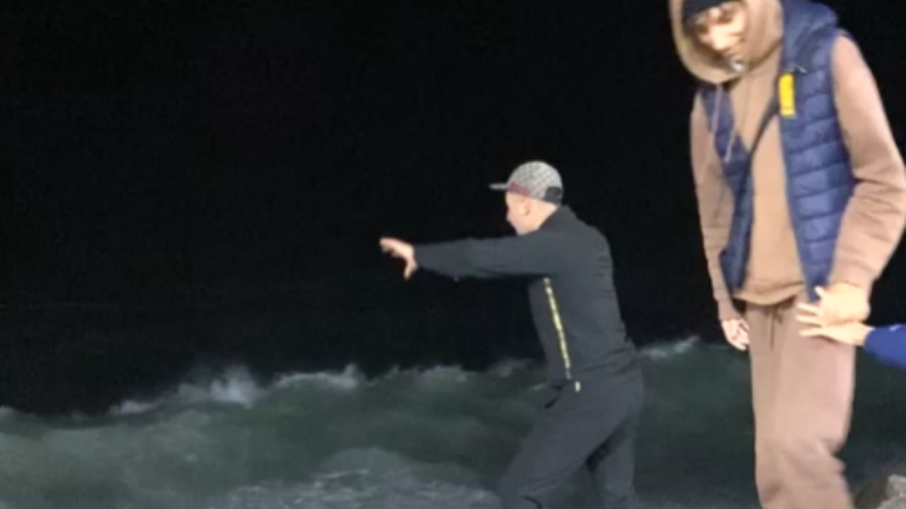 Boy stands by the sea and creates a fun illusion as waves rise and fall