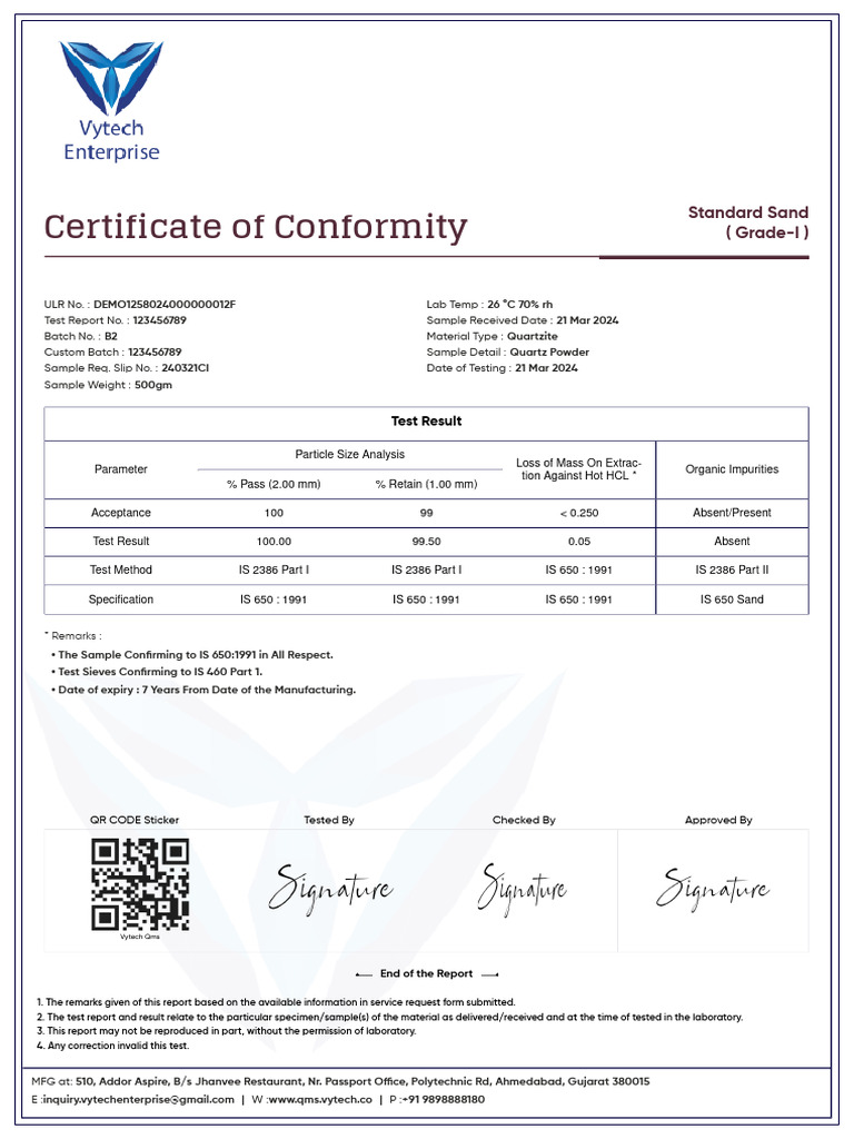 Certificate of Conformity: Standard Sand (Grade-I) | PDF | Materials ...