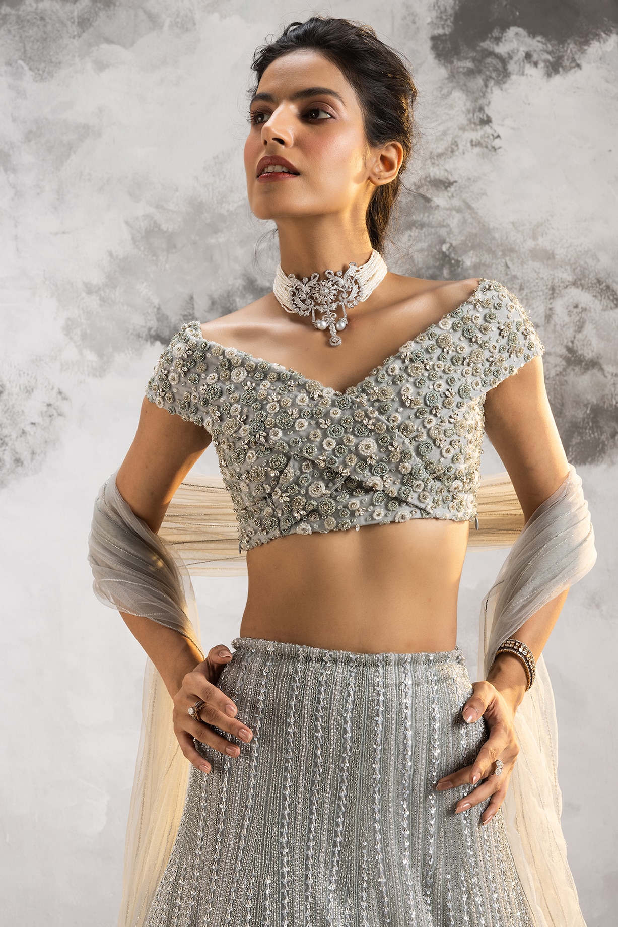 Buy Powder blue pearl cape and skirt set by Couture by Niharika at ...
