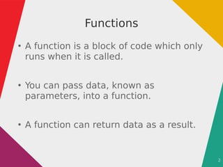 Based on this image's title: “Python functions - Functions A block of code which we can use many ...”