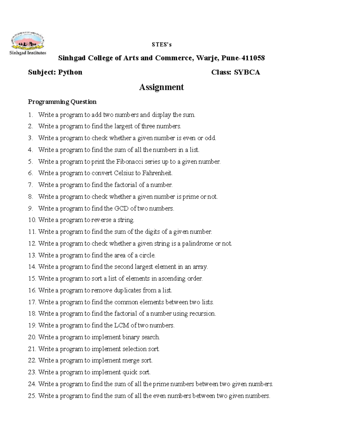Python Assignment SYBCA: Programming Tasks and Solutions - Studocu