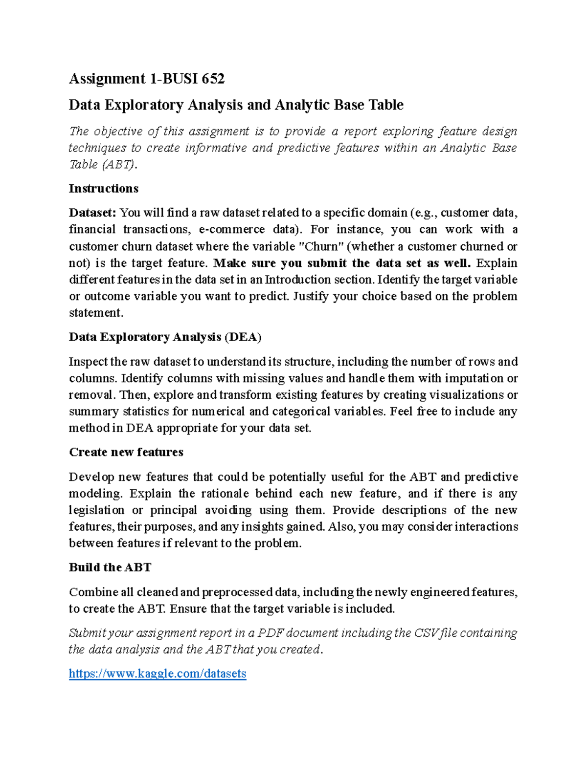 Assignment 1-Chapters 1-3 - Assignment 1 - BUSI 652 Data Exploratory ...