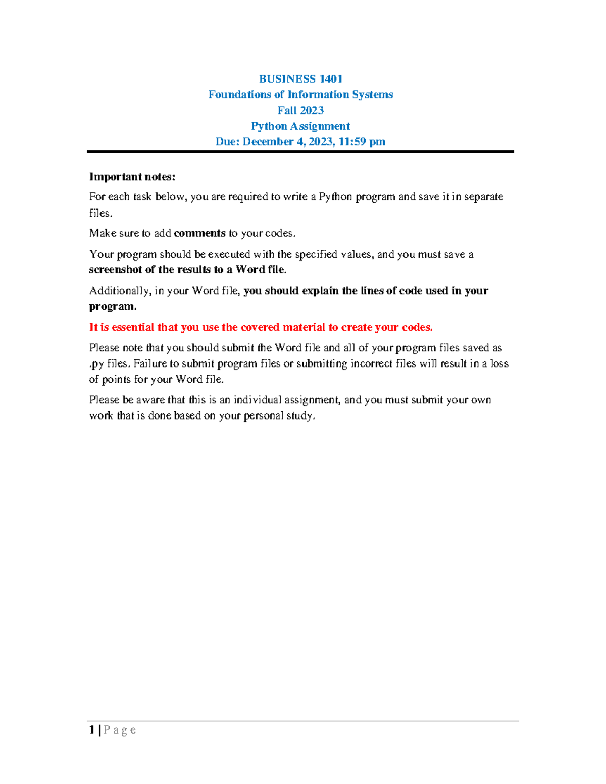 Python Assignment - BUSINESS 1401 Foundations of Information Systems ...