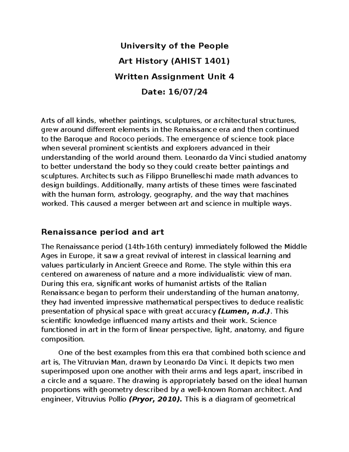 AHIST 1401 Written Assignment 4: Art and Science in Renaissance to ...