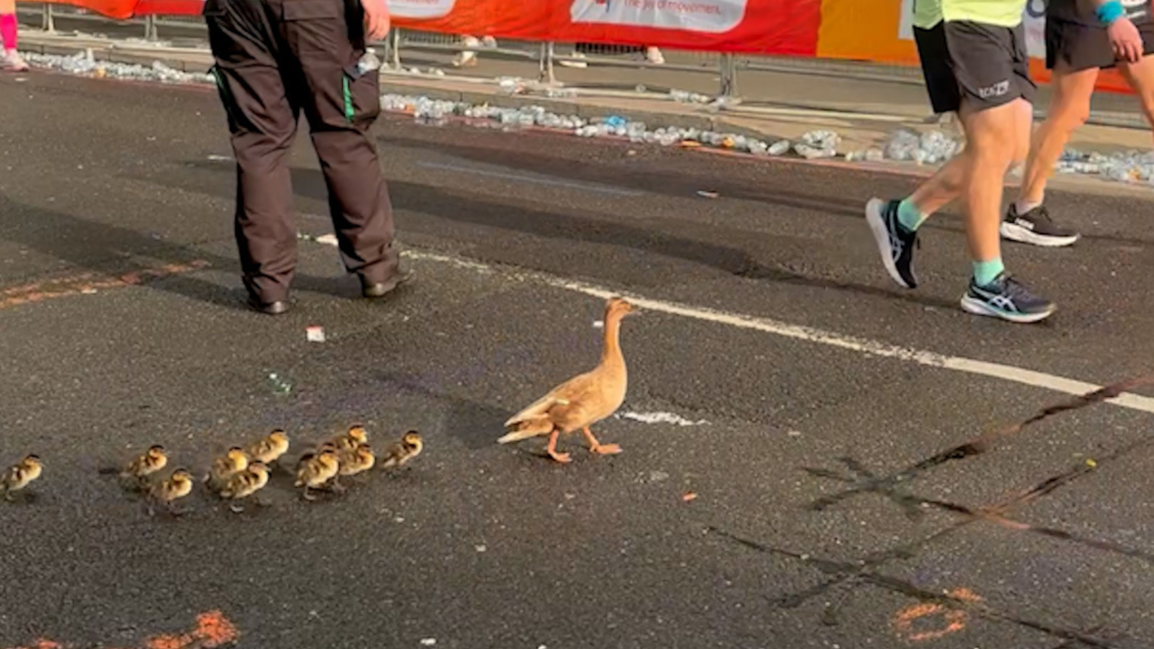Runners halted by family of ducks - crossing the London Marathon route