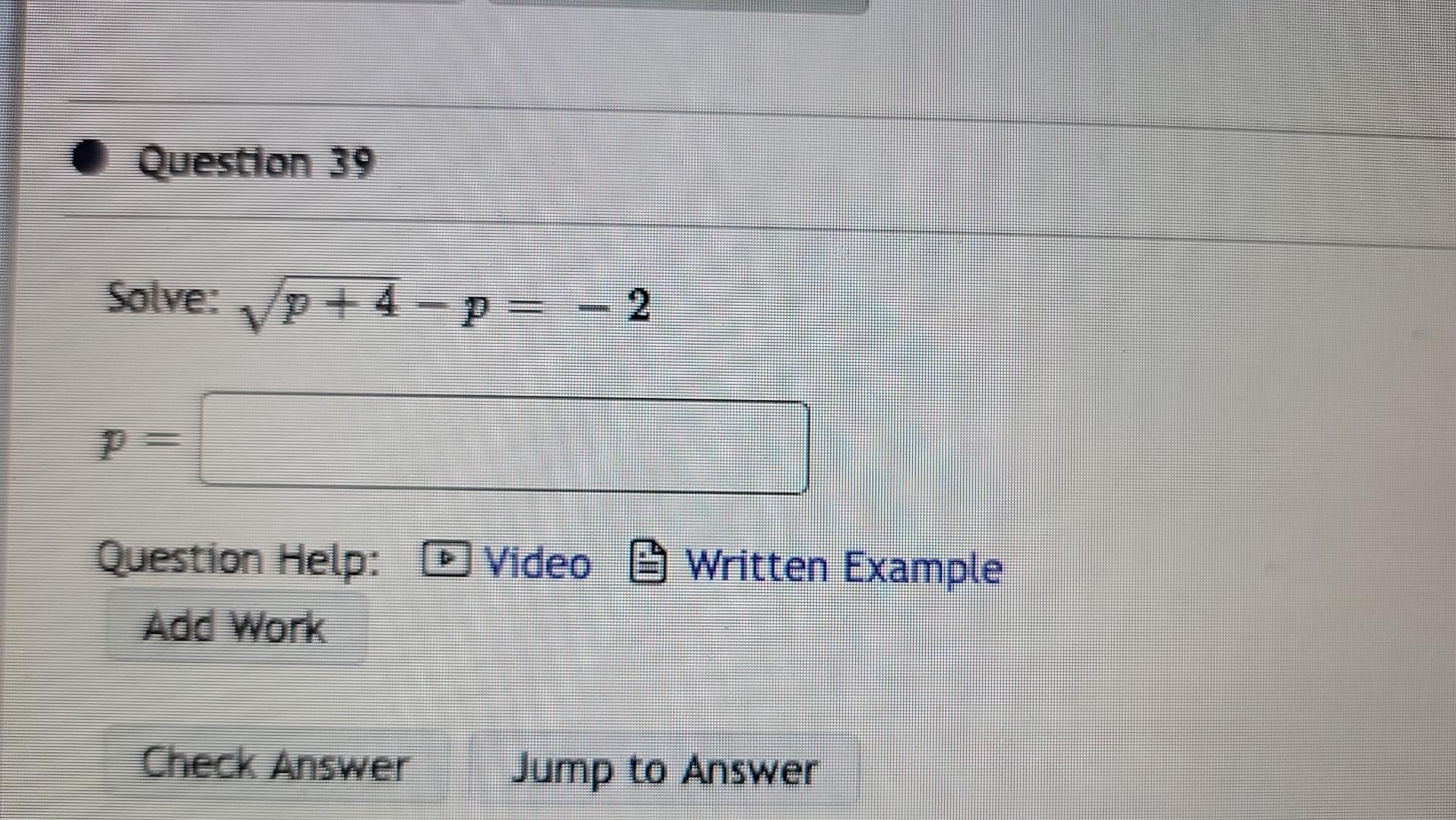 Solved Question 39 Solve: √√p+4-p= − 2 Question Help: Video | Chegg.com