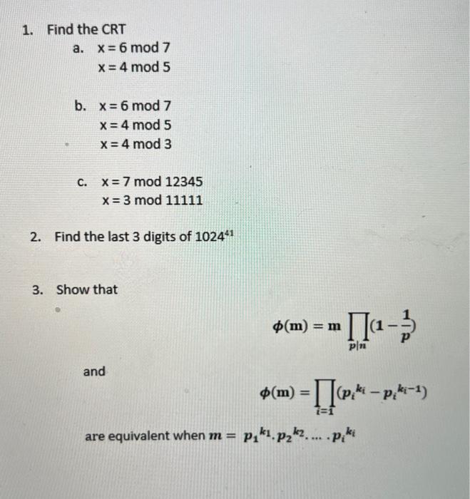 Solved a. x=6mod7 x=4mod5 b. x=6mod7 x=4mod5 x=4mod3 c. | Chegg.com