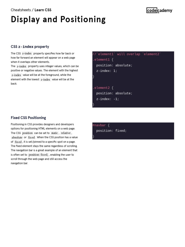 Learn CSS - Codecademy - Cheatsheet - Display and Positioning | PDF ...