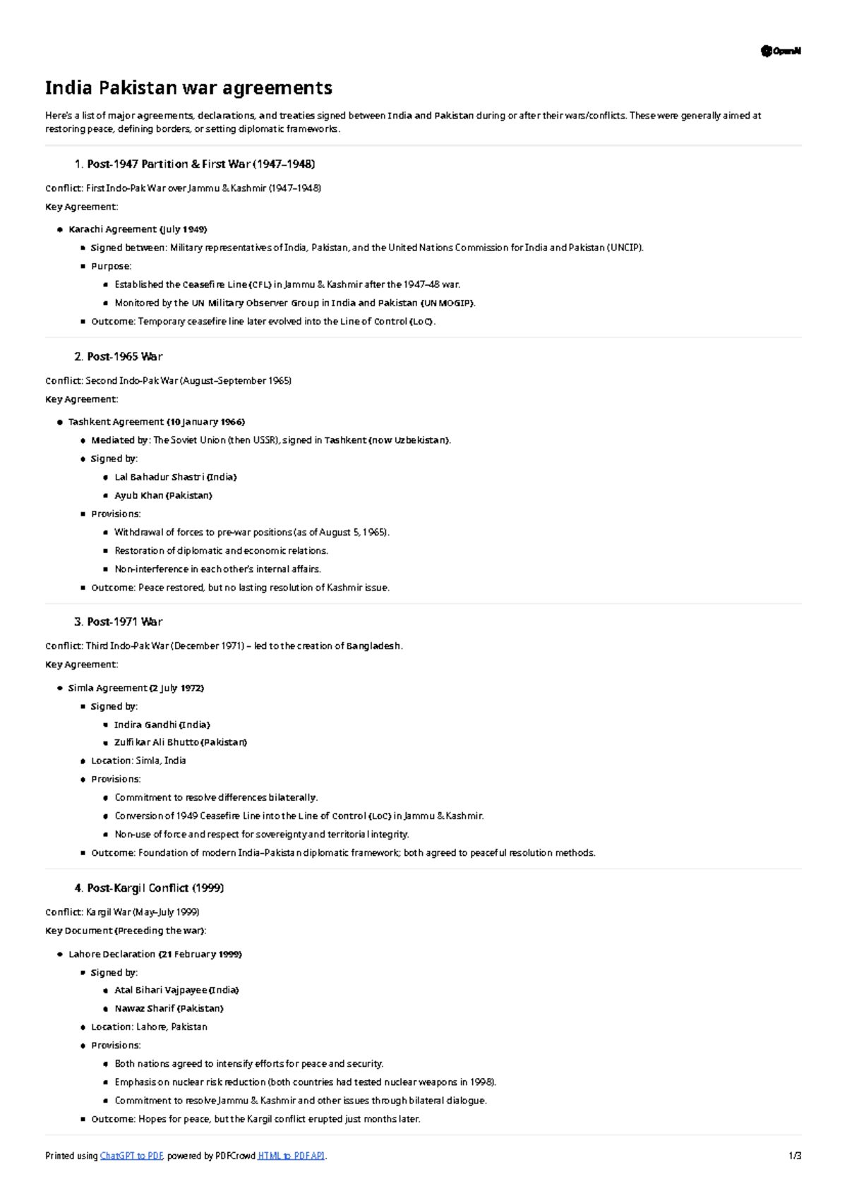 India-Pakistan War Agreements: Key Treaties and Declarations - Studocu