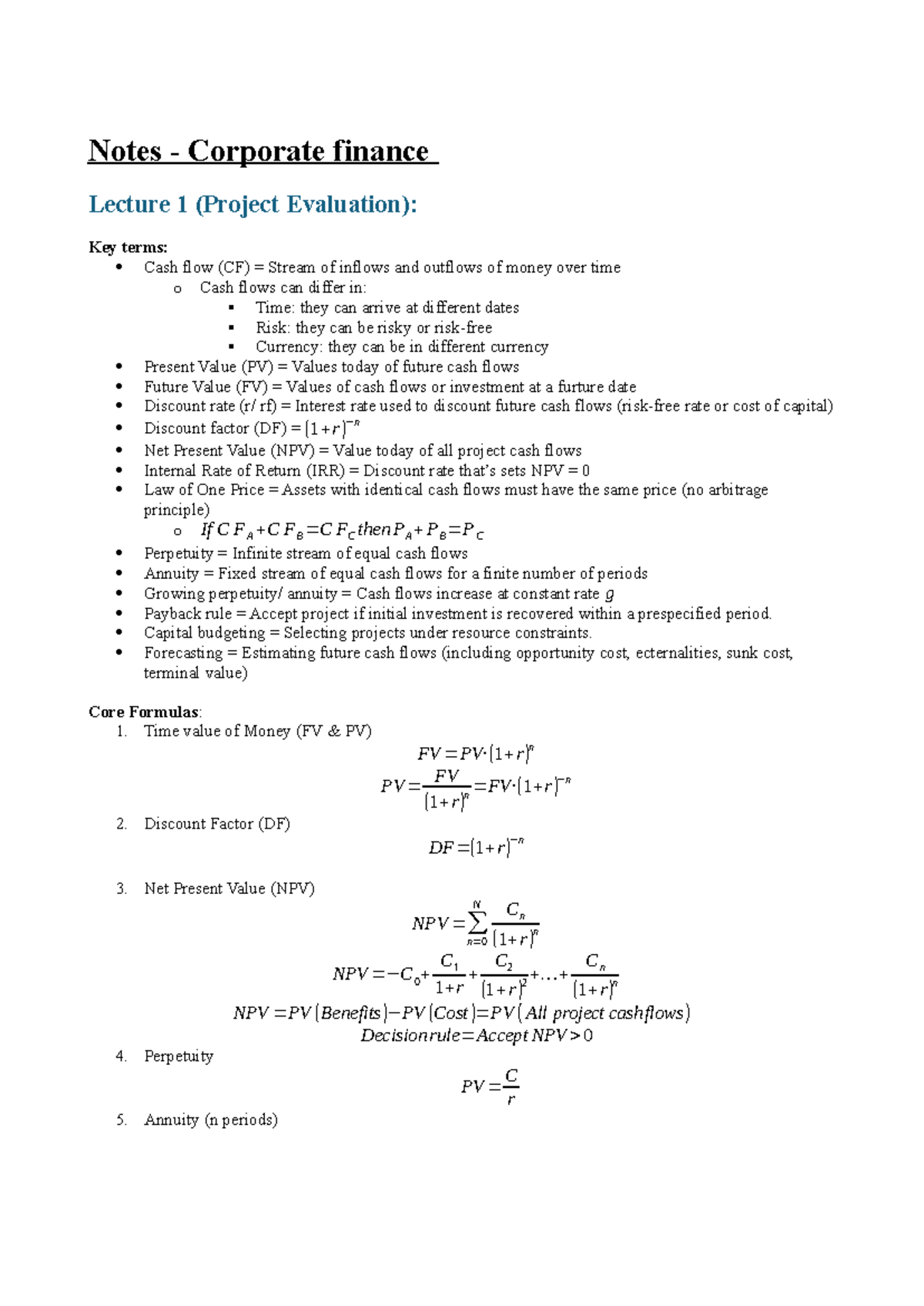 Corporate Finance Lecture Notes: Key Concepts & Formulas - Studocu