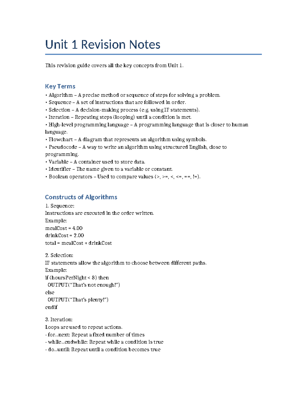 Unit 1 Revision Notes: Key Concepts in Algorithms and Pseudocode - Studocu