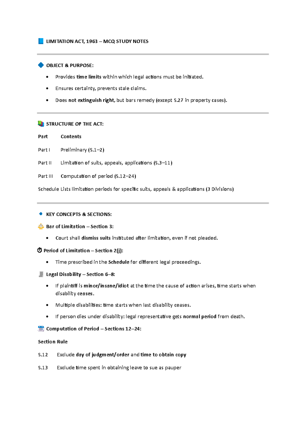 Limitation Act, 1963: MCQ Study Notes & Key Concepts - Studocu