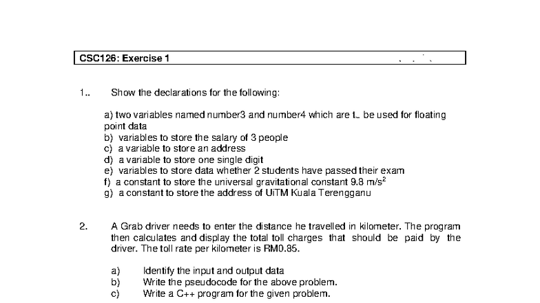 CSC126: Exercise 1 - Variable Declarations and Program Design - Studocu