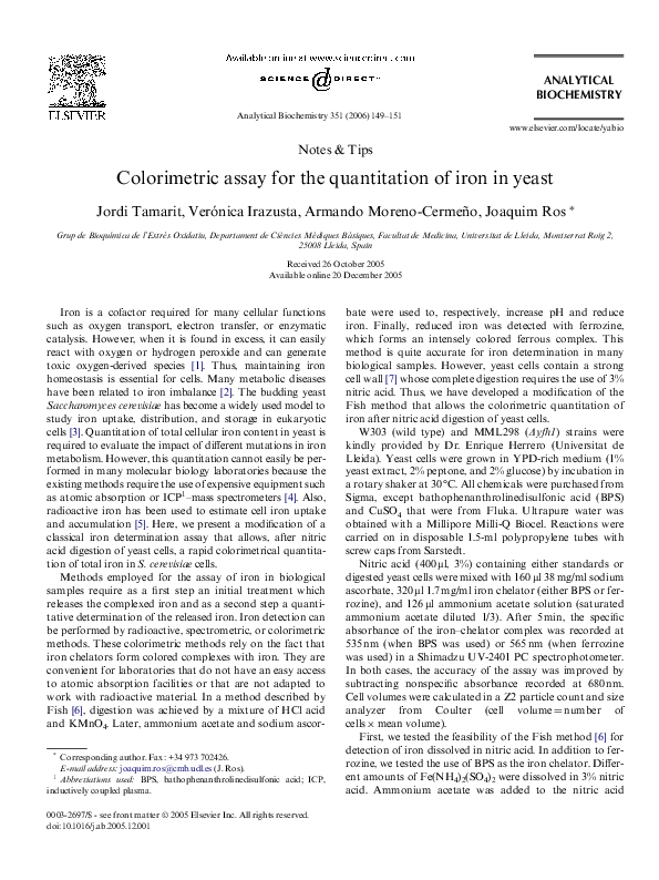 (PDF) Colorimetric assay for the quantitation of iron in yeast