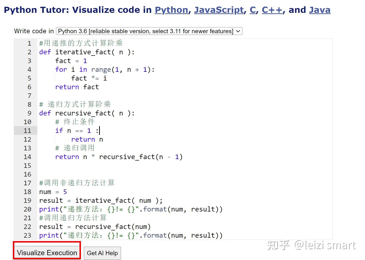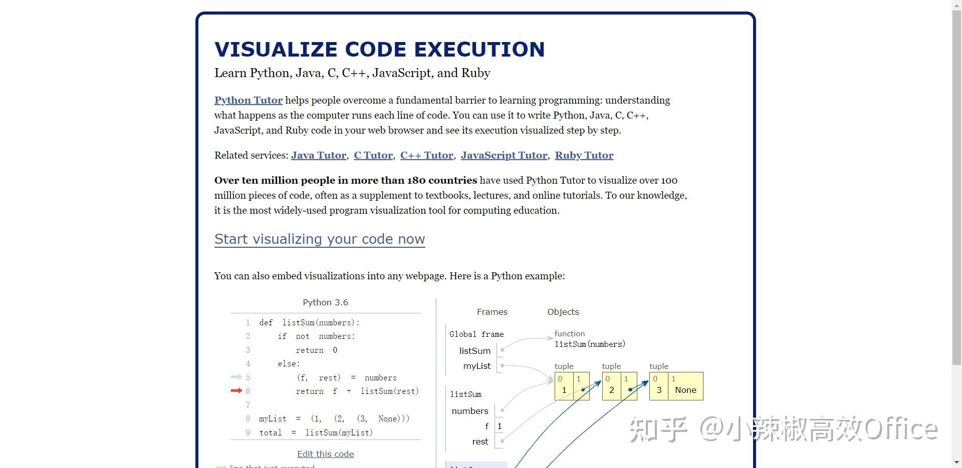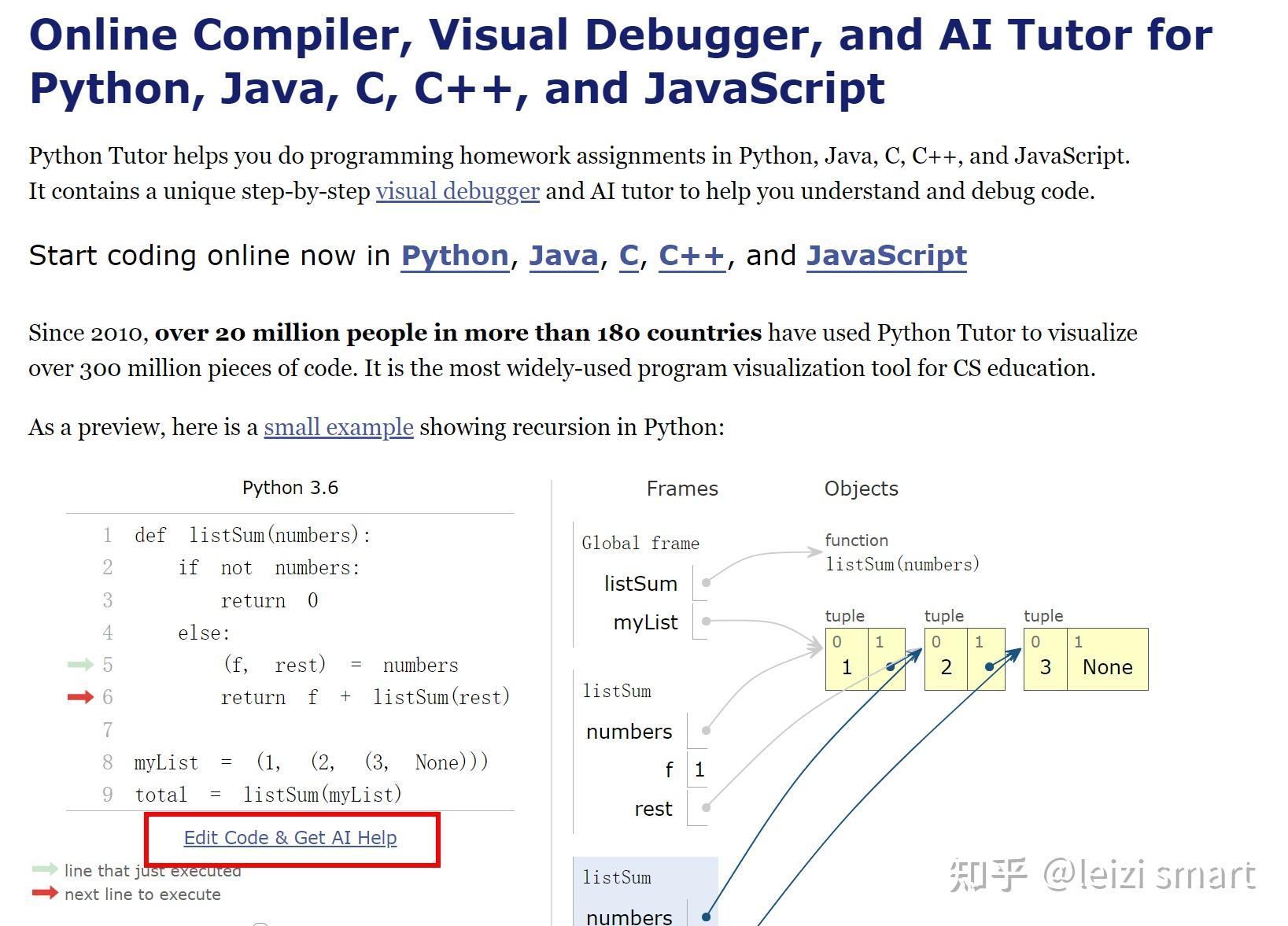 Python Tutor 代码可视化工具 支持Python、JavaScript、C、C++ 和 Java等 - 知乎
