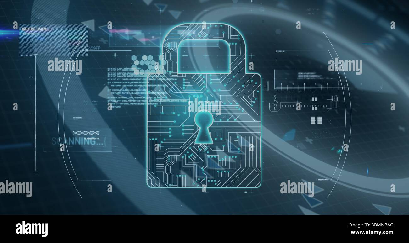 Floating glowing teal padlock icon in virtual interface, with hexagonal ...